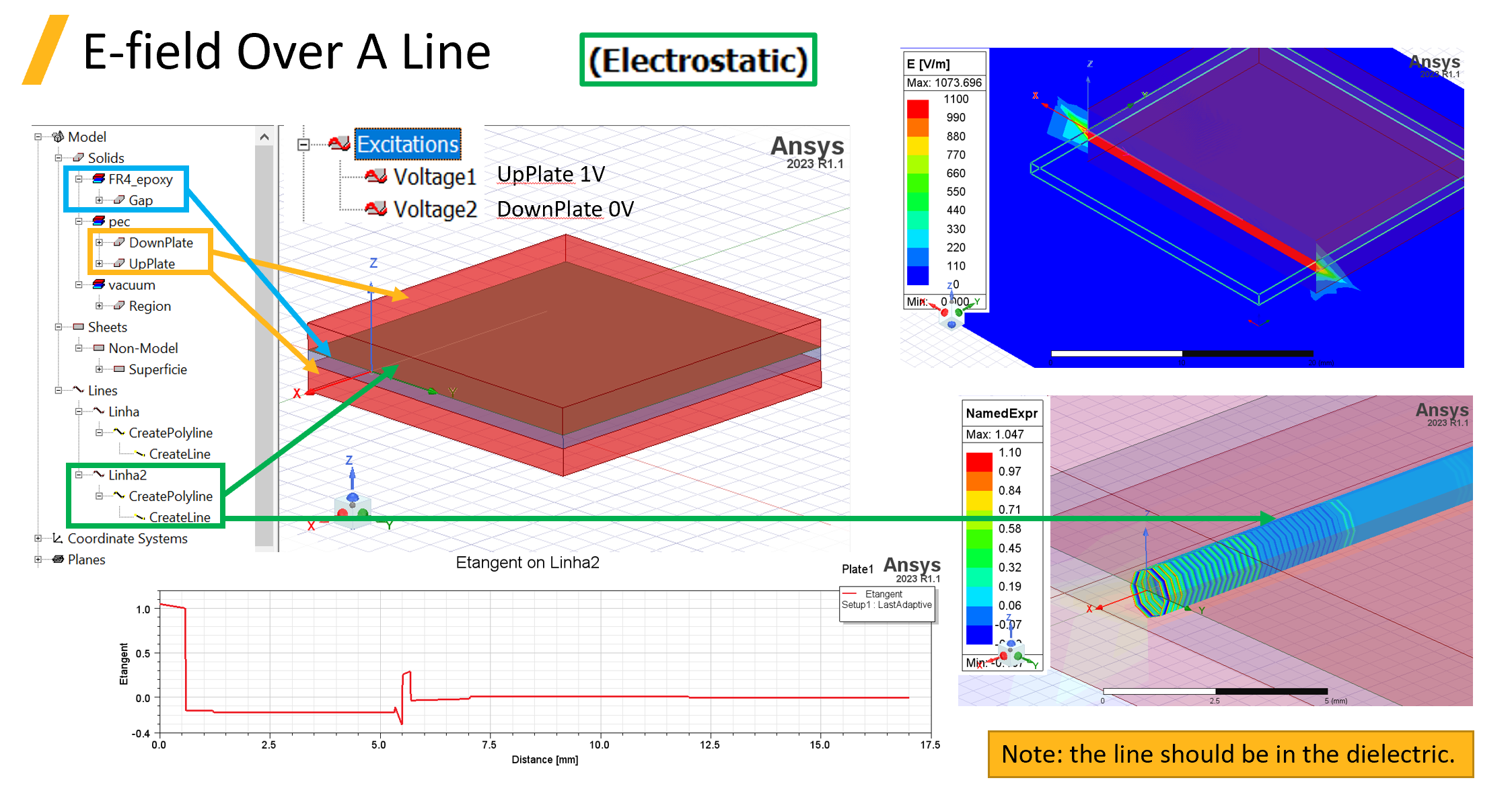電場在線段上的垂直分量計算分法如圖2-21。計算完後,在Report中創造一個新報告,裡面的Geometry選擇計算的線段,並從Calculator Expressions選Etangent就可以畫出電場的垂直分量。