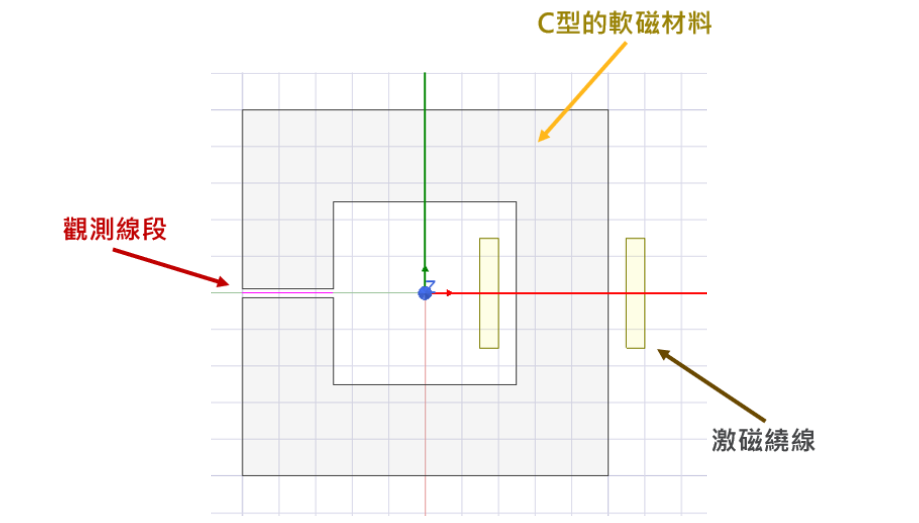 圖3-1是一個Maxwell 2D的C core模型,裡面包含了C core的軟磁材料、激磁繞線組以及觀測的線段。