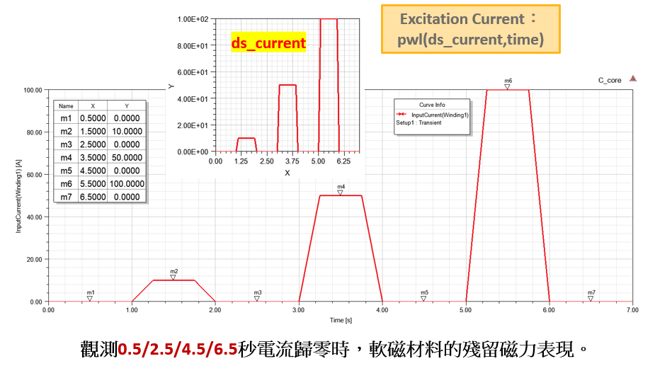 接著要設定輸入的激勵電流,藉由電流激磁來觀測0.5/2.5/4.5/6.5秒電流歸零時,軟磁材料的殘留磁力表現。