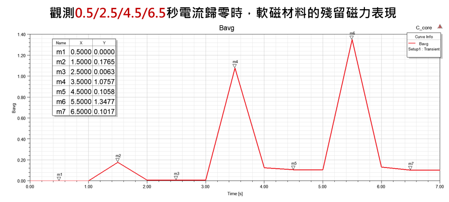 由設置磁滯損失模型,再通電過後的模擬。如圖3-6,觀察軟磁材料的殘留磁力,且當電流逐漸增加至滿足操作點可描繪BH的major loop,模擬也能表現出對應的殘留磁力關係。