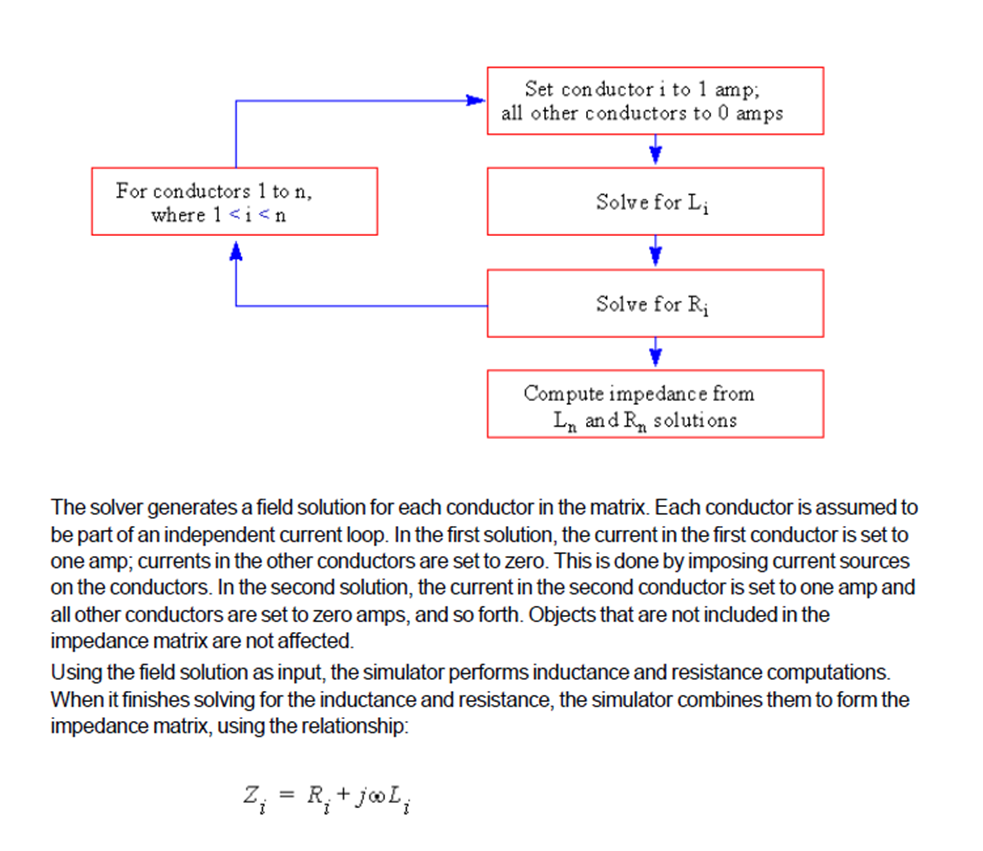 為了計算阻抗解的感應和阻抗矩陣，求解器為矩陣中的每個導體生成感應電流做場的求解。在第一個解中，<mark style="background-color:red;">第一個導體中的電流設為 1 安培，包含在阻抗矩陣中的其他導體電流設為零。</mark>這是通過在導體上加入電流源實現的。在第二個解中，第二個導體中的電流設為 1 安培，包含在阻抗矩陣中的其他導體電流設為 0 安培，以此類推。未包含在阻抗矩陣中的導體不受影響。