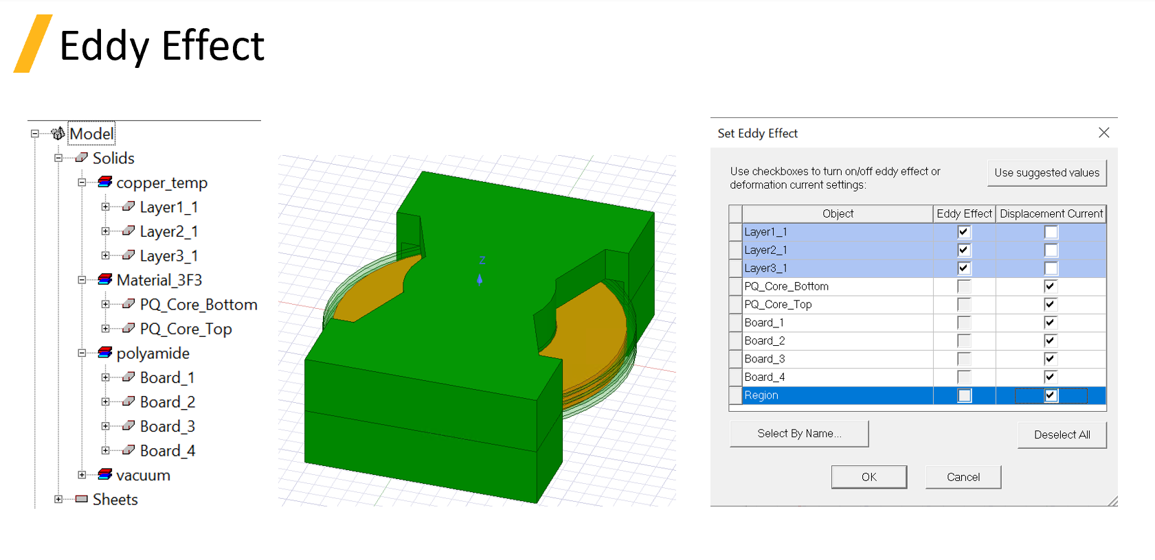 Eddy Effect（及膚/鄰近效應）僅能針對導電率非零的物體進行指定。Maxwell 軟體的預設條件，是預先把 eddy / displacement current effects 關閉。<mark style="color:red;">將這些效應納入計算中</mark>可能對求解時間產生潛在重大影響，因為啟動了電矢勢計算，如果具有要計算電矢勢的區域有大量有限元素，則解決矩陣的大小會顯著增加，<mark style="color:red;">會增模擬時間</mark>。 位移電流 ( Displacement Current ) 計算通常在介電體（包括真空）中啟用，允許電磁波傳播。在這種情況下，應該在問題設置中使用輻射邊界條件。