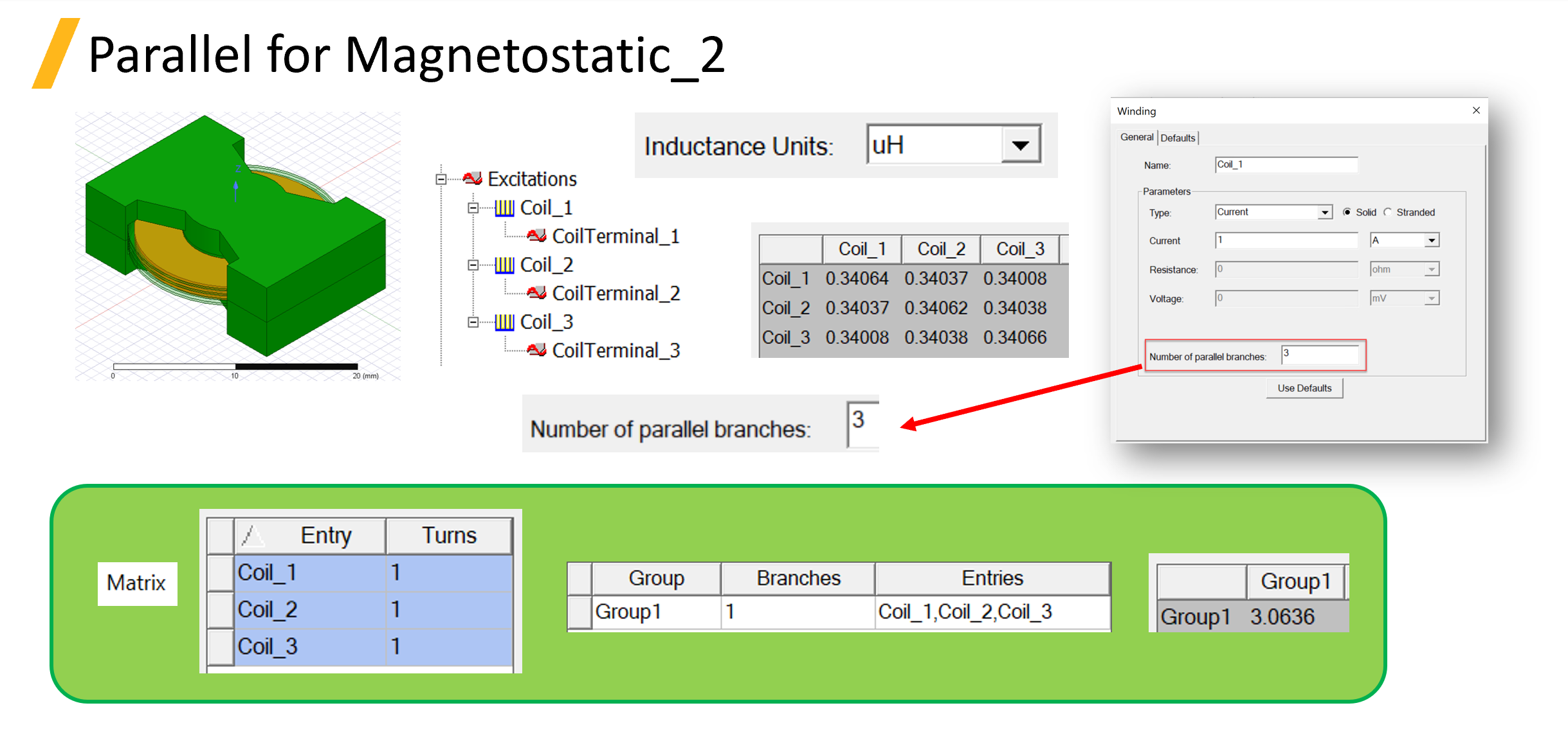 2. 當 CoilTerminal 使用不同的 Winding 時，可以用第二種 Matrix 方法。在激勵源為不同Winding時，同樣的<mark style="background-color:blue;">將每一組 Winding 的 Number of parallel branches 設定為並聯數。最後在 Matrix 將其放入同一個Group 中且 Group Branches設定為 1</mark> 做計算。