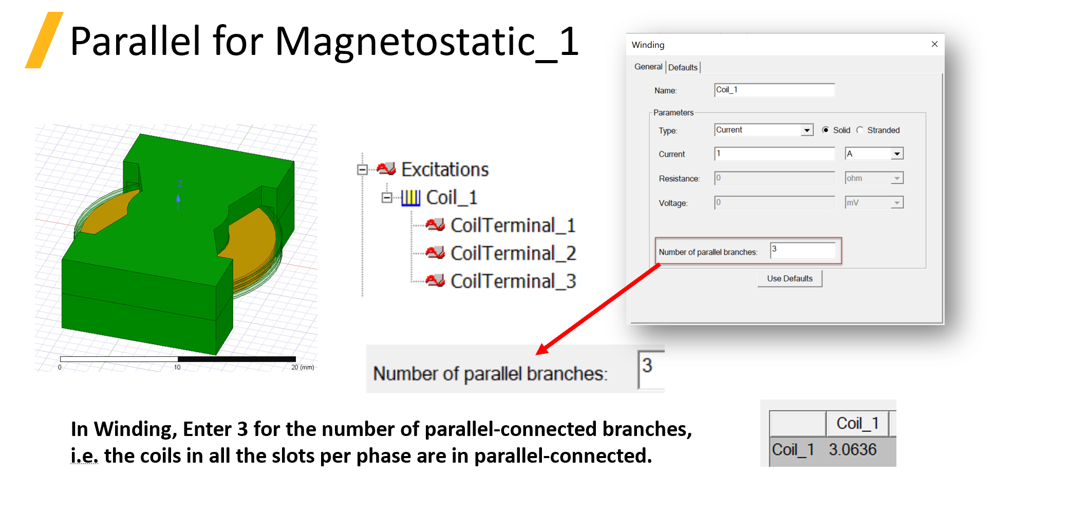 * 「Number of parallel branches」 設定僅適用於電流均衡且無環流（circulating current）的情況，特別是對於 solid 或 stranded 線圈，假設各支路電流完全相等，且不考慮支路間的非對稱磁場導致的環流。