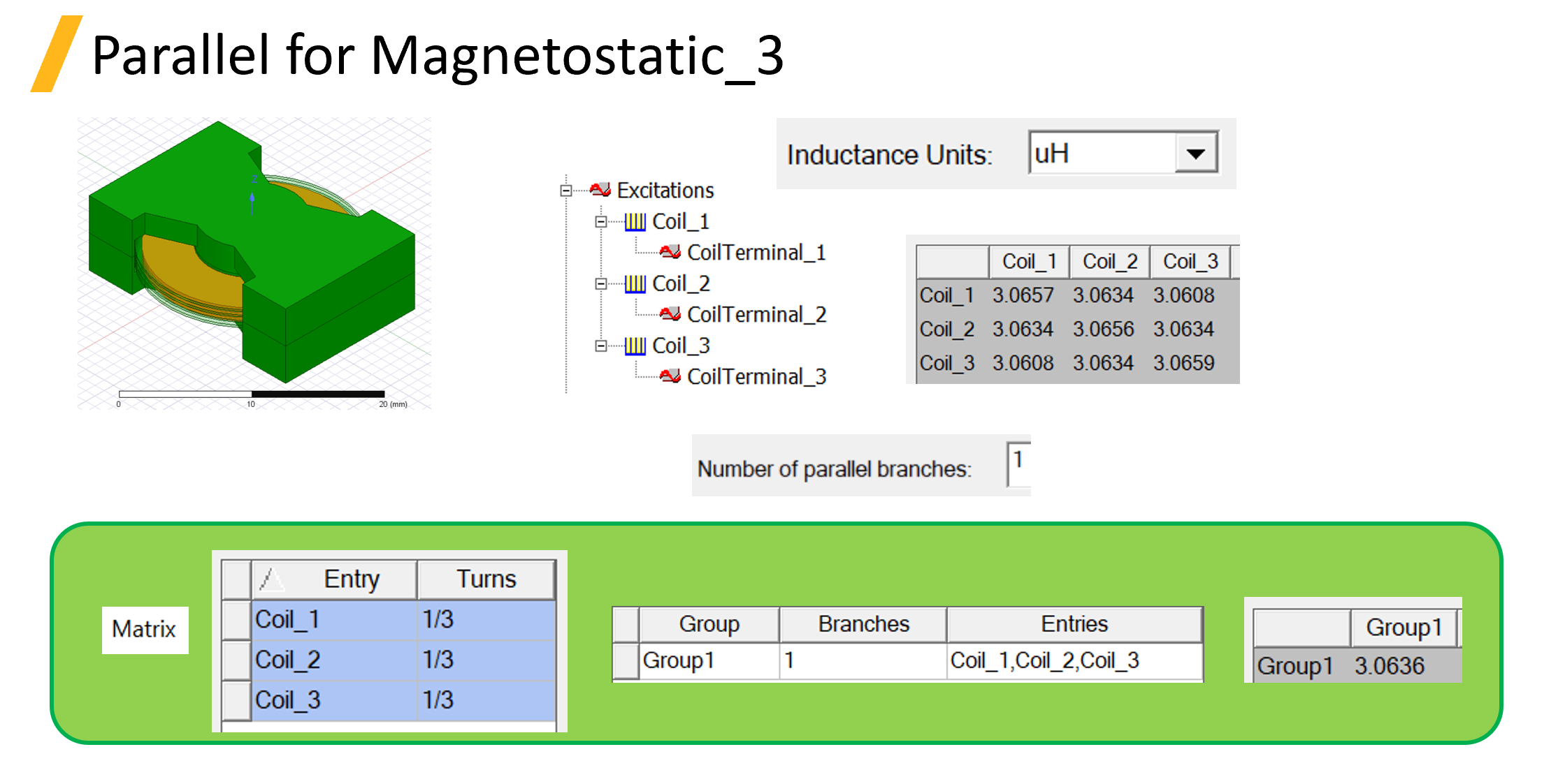 若是要做並聯的應用，筆者這邊介紹三種方法。除了第一種，二、三種都是利用 Matrix 的後處理計算來達成並聯電感計算。