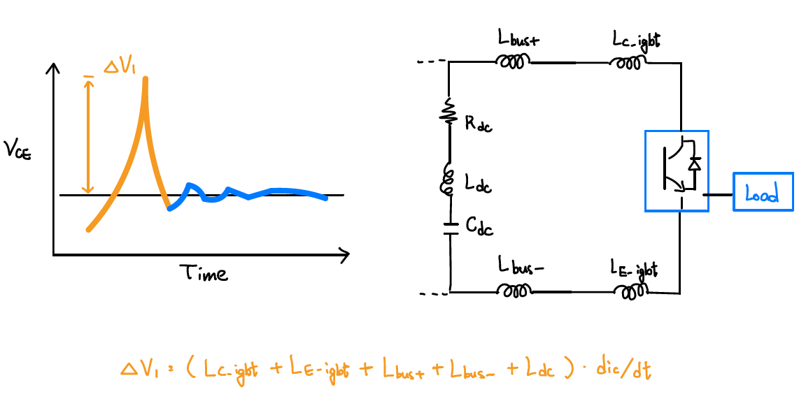 如果再細部拆解分析，如果沒有 Snubber 電容，IGBT 上 VCE 的第一個 V1 電壓差會和整體迴路漏感相關。如圖0-3，第一個 V1 電壓差非常高，在小馬力機種中，如果對各元件與 Busbar 的寄生電感做優化，是有機會不使用 Snubber 的電容。