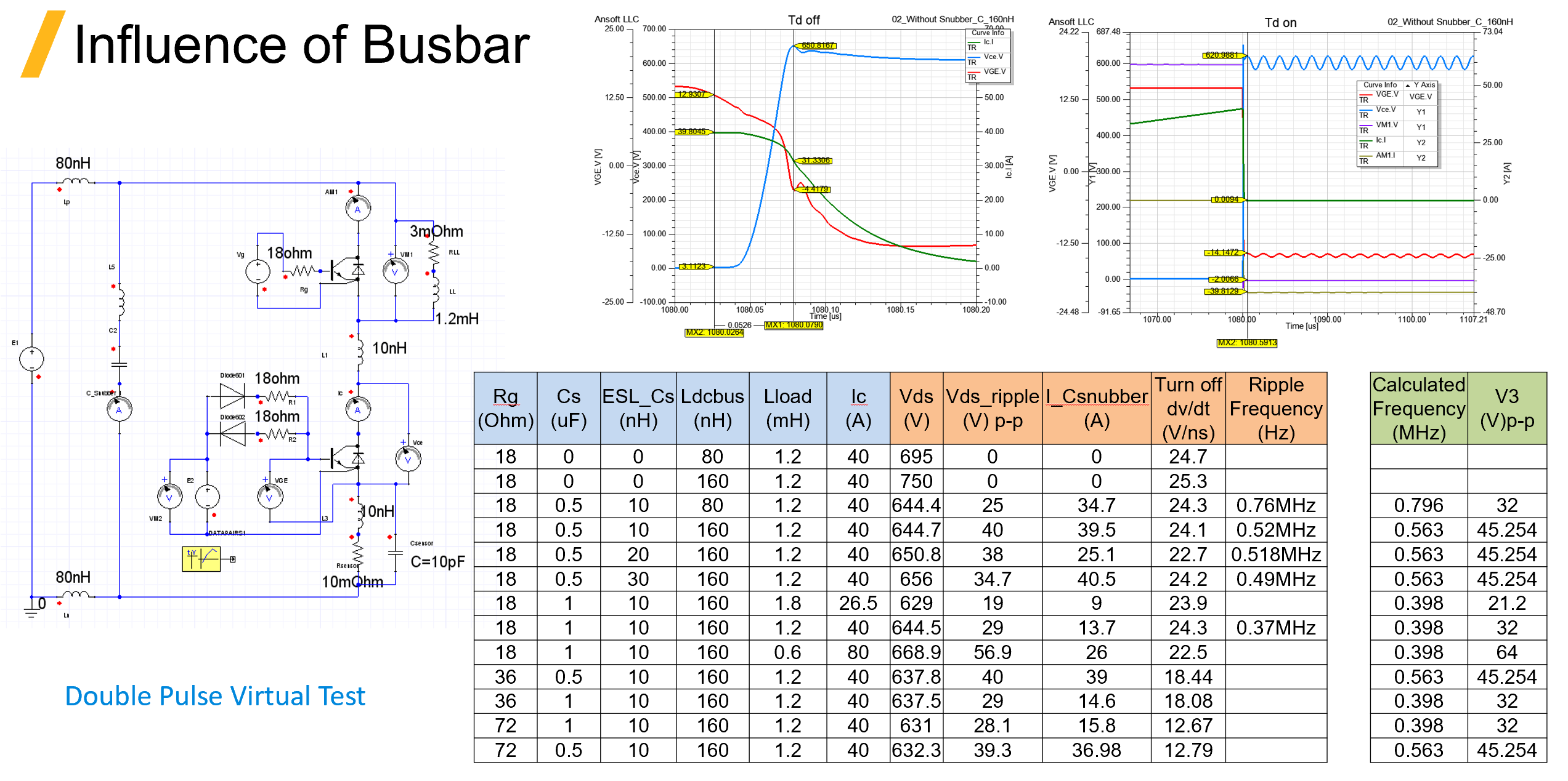 以 DPT (Double Pulse Test) 測試來看，當我們固定除了 Busbar 的漏感的所有條件，在沒有 Snubber 電容下，可以看到第一行與第二行的漏感由 80nH ->160nH 的時候，Vds-Peak 會由 695V->750V。再譬如第三行與第四行的結果，當有考慮 Snubber 電容的情況下，Vds 的 ripple 會由 25->40V。