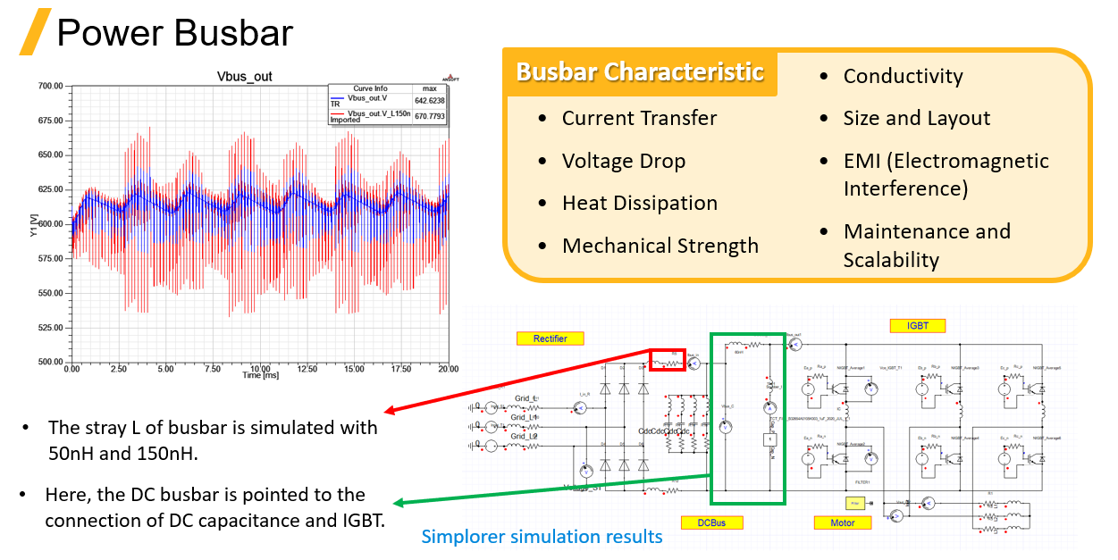 以一個馬達驅動器的電路來說，如果大電流快速開關地流經電感，會在電感上產生一個很大的電壓變化量，因為 Busbar 的漏感值過大時，DC 電容上的電壓加上漏感上的瞬間電壓變化，有機會大於 IGBT 可承受的電壓值，因此需要計算 Busbar 漏感值對應於電路上 IGBT 是否可以承受。